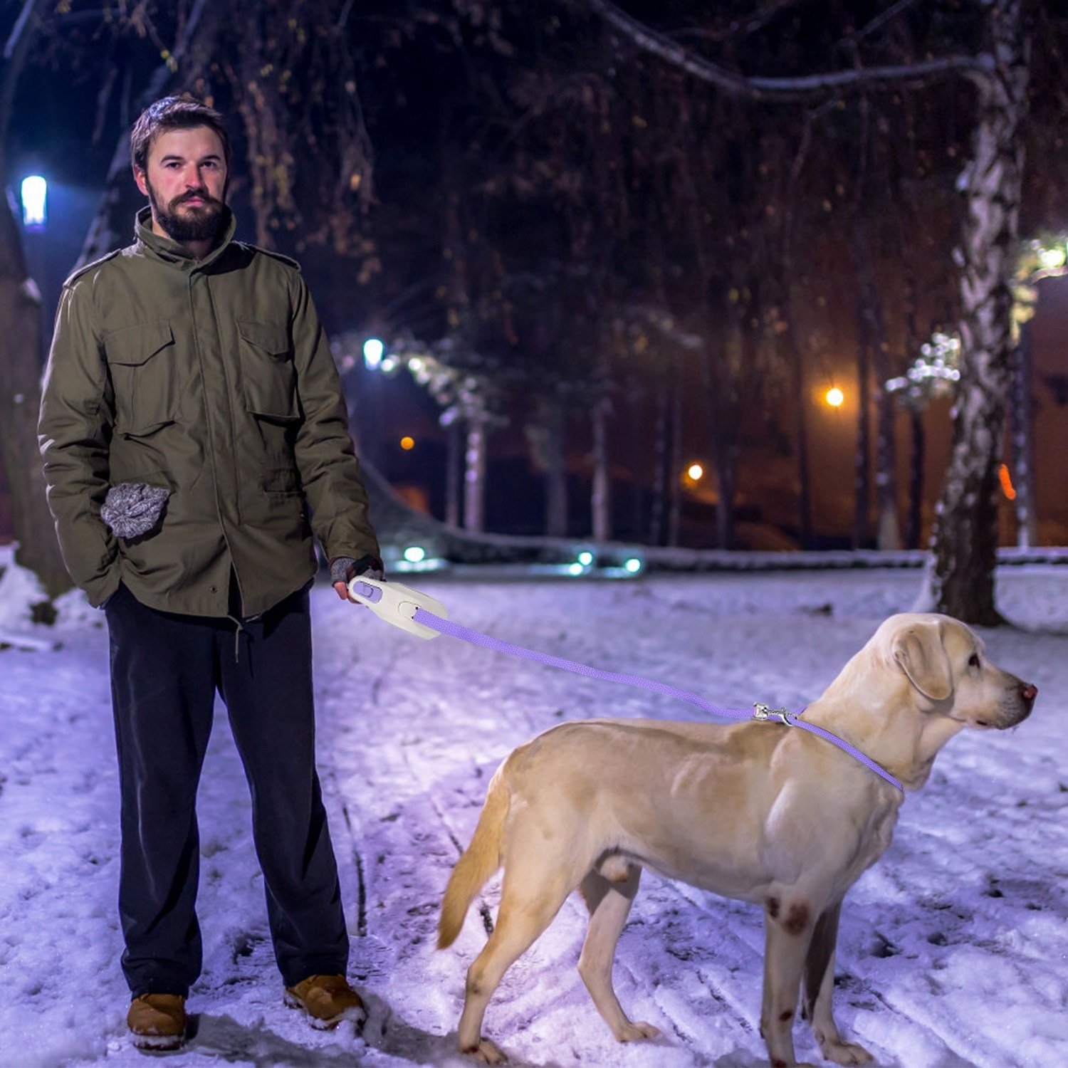 *2 Lighting Modes*:Built in visible spotlight,our retractable walking leash clears your vision within 5m/16.4ft in the dark,which helps to notice potential dangers in the dark,clean up dog poop conveniently etc.. Featured with a cool ambient RGB light(green/blue/purple/yellow/red/cyan change gradually),the rope case shines brighter in the crowd,creating a sense of social atmosphere.